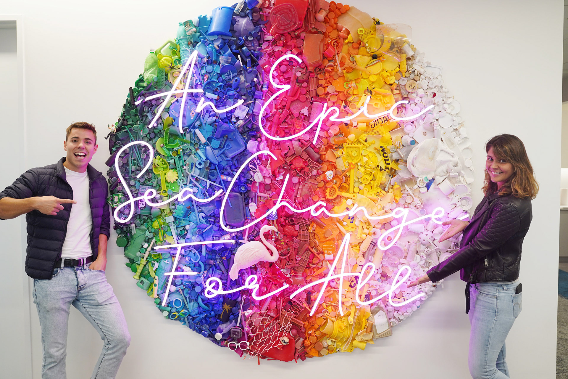 Last year we were commissioned by Virgin Voyages to concept, design & build an art piece that sailed home their core company message “An Epic Sea Change For All” and commitment to fighting the ocean plastics problem we face on a global level. Our first Strategy was to create a team building event with the help of Debris Free Oceans & VolunteerCleanup.Org who were also instrumental in providing us with additional pre-separated plastics provided from over 15 coastal clean-ups. Our team spent countless hours meticulously hand selecting and placement of each piece. Measuring at over 7' in diameter, 80+ pounds of ocean plastics and eco-friendly LED neon, we couldn't be happier with how this came out. photo credit: World Red Eye