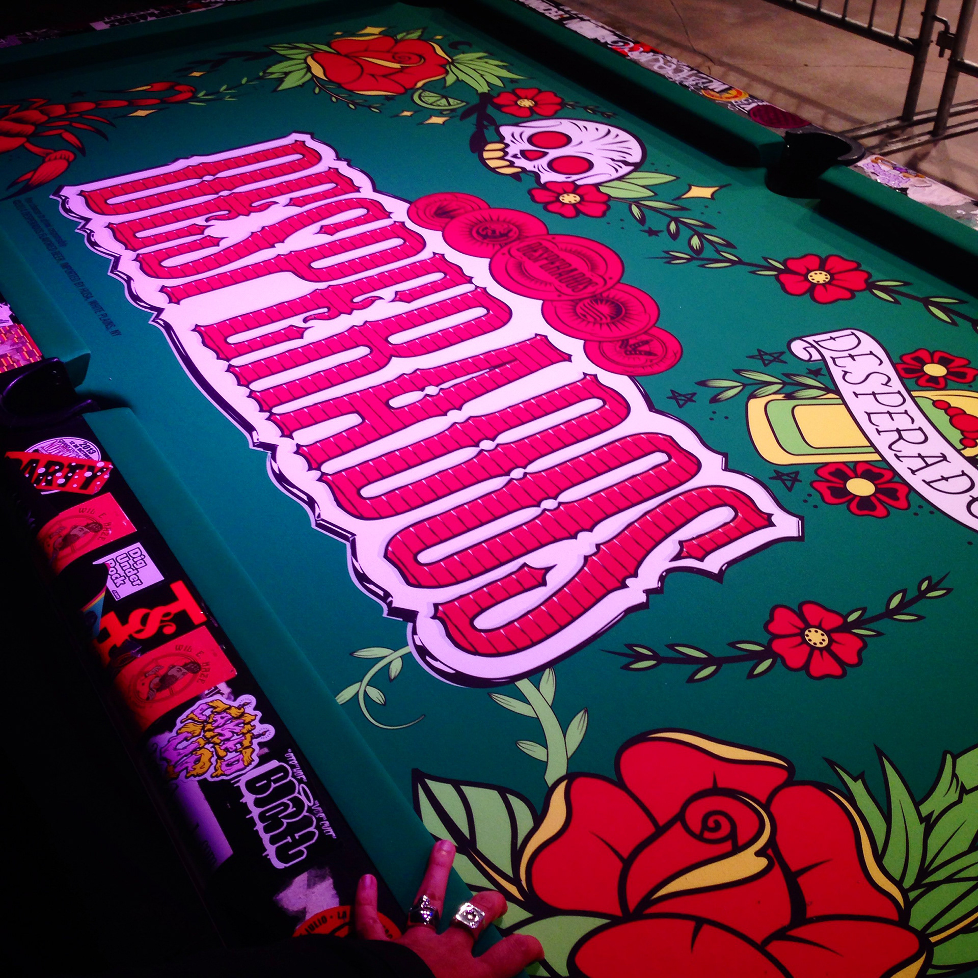 Custom designed pool table felt with American traditional tattoo style art using the brand's attributes. The table was installed at Grand Central in Downtown Miami which is a liver performance venue.